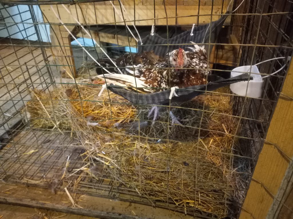 - Next up was medical care for one of our hens with a broken leg (femer/thigh bone). We had tried to splint the bone previously, but she manages to tear that off and still hops around aggravating the injury with her bad leg sticking out at an awkward (and gross) angle. After some research, we determined we needed to immobilize her so she can’t keep working against her healing. Our solution was a whole body sling that we strung across a empty wire dog crate/kennel. The kennel also serves to protect her from other aggressive birds who will naturally prey upon the ones that are sick or injured. We already had her separated in the “infirmary”, where all birds reside when they aren’t 100% but in her desire to remain social, she’d try to hobble outside and talk to her mates through the fence.